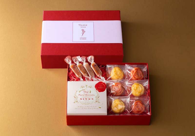 可愛らしいバラの形に焼き上げた2種類のフィナンシェと、フランボワーズの酸味にバラが香るキャラメルを紅茶またはコーヒーとセットにしてお届けします。